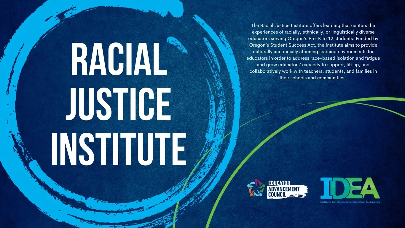 The Racial Justice Institute from 2021-2023 offered learning that centers the experiences of racially, ethnically, or linguistically diverse educators serving Oregon’s Pre-K to 12 students. Funded by Oregon’s Student Success Act, the Institute provided culturally and racially affirming learning environments for educators in order to address race-based isolation and fatigue and grow educators’ capacity to support, lift up, and collaboratively work with teachers, students, and families in their schools and communities.